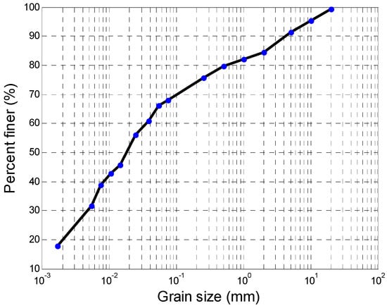 In this paper, the uncertainty analysis was conducted on data of granite residual soil collected from Yudu in Jiangxi Province, China. Yudu is hilly and has undergone serious collapsing erosion. Granite residual soil is distributed widely. Samples of the granite residual soil were taken from open pits excavated to a depth of 0.5 m below ground surface. Dry-sieving analysis was performed, and the grain-size distribution is shown in Figure 1. The soil had a liquid limit of 40%, a plastic limit of 27.5%, a plasticity index of 12.5, a specific gravity of 2.73, and a maximum dry density of 1.76 g/cm3. These soil properties were measured for the granite residual soil using standard soil test methods (State Standard of the People’s Republic of China).