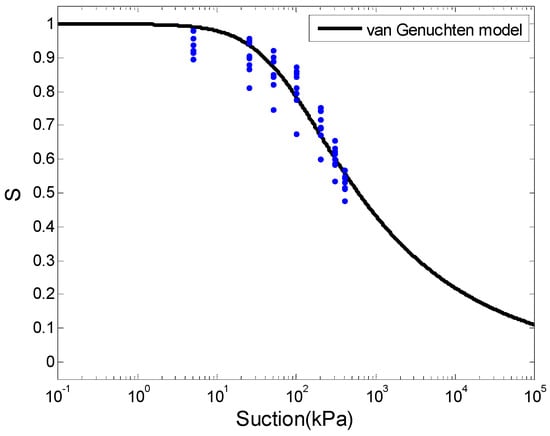 The soil particles were first sieved with a sieve of 2-mm aperture size, and particles with a dimension larger than 2 mm were discarded. The experimental specimens were prepared for dry densities of 1.45 g/cm3, 1.50 g/cm3, 1.55 g/cm3, 1.60 g/cm3, 1.65 g/cm3. The particles (which were also sieved with sieves of 0.5 mm and 1 mm aperture size, respectively) were made into soil specimens with a dry density of 1.60 g/cm3. The SWCCs were measured by means of a pressure plate extractor (GEO-Experts) that realized the soil specimen drying or wetting process by increasing or decreasing the matrix suction, which was based on the axis translation technique. Soil specimens were prepared using a cutting ring of 70 mm in diameter and 19 mm in height. The soil specimens were remolded. The SWCCs were measured following the drying path in the suction range of 0–400 kPa. Seven soil samples in total were used in the study. Among them, 49 suction-degree of saturation pairs were obtained, and are plotted in Figure 2. The details of fitting SWCC using optimal model parameters in Figure 2 are presented in Section 4.1.