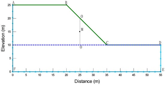The current methods used to calculate the safety factor generally include strength reduction methods and limit equilibrium methods [52]. In this paper, the limit equilibrium analysis was carried out with the widely used Morgenstern–Price method [53]. Calculating the safety factor using this method requires less computational effort and time. The commercially available software, SLOPE/W, was used to calculate the safety factor of the slope under rainfall [54]. Soil mechanical properties were taken from Section 2.2.