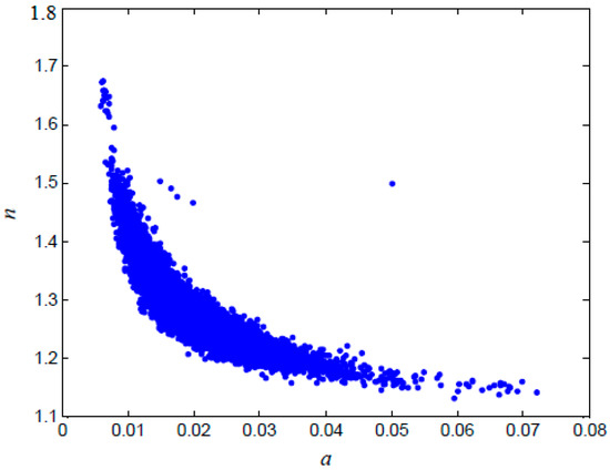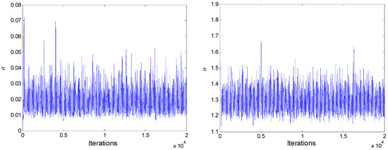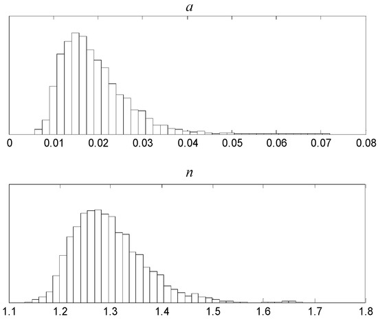 The 3000 samples before convergence were discarded and not used for posterior statistical inference. The remaining 17,000 samples were used as the posterior distribution samples. The relationship between the random variables and the associated histograms for random variables are presented in Figure 5 and Figure 6, respectively. The statistics of the posterior distributions can be summarized as follows: the posterior mean and standard deviations of were 0.0190 and 0.0071, respectively; and the posterior mean and standard deviations of were 1.2962 and 0.0686, respectively.