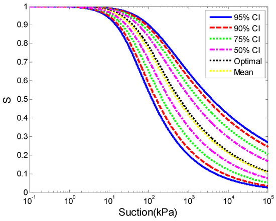 Bayesian analysis was carried out based on the SWCC proposed by Van Genuchten, and the MCMC method was used to sample the posterior PDF of the SWCC model parameters, as MCMC is very flexible given that any type of prior distribution can be used and it is efficient for highly non-linear problems [44]. The advantages of using the MCMC method is that the normalization factor may be avoided, which is generally difficult for multiple dimensional problems [19,45]. A possible limitation of MCMC is that it requires iterative evaluation of the model. There are many types of MCMC method. The DRAM algorithm proposed by Haario et al. [21] was adopted in this study due to its high effectiveness. The relevant details of DRAM can be found in Haario et al. [21]. The uncertainty of the SWCC model parameters can be evaluated and different confidence intervals of the SWCC obtained using the Bayesian approach and the MCMC method. The SWCC associated with various confidence intervals can be evaluated by the Bayesian approach as follows: