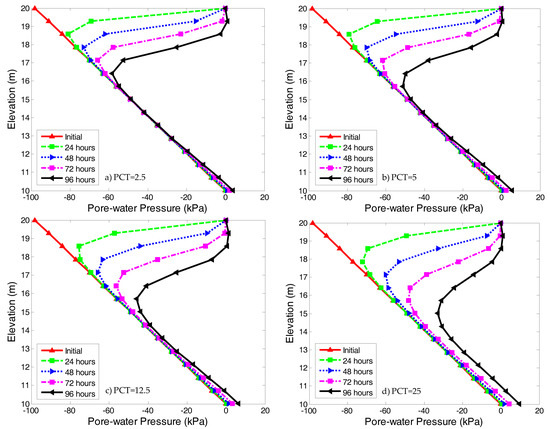 The pore-water pressure profiles were influenced by the different set of parameters obtained through the statistical analysis for different PCT. For soil with PCT = 2.5%, the wetting front was sharp and distinct, as shown in Figure 8a. Water continued to flow downward through the soil, and the negative pore-water pressure decreased at shallow depths in the slope. The downward movement of the wetting front in the soil was slow. After 96 h of rainfall, the depth of the wetting front was only about 4 m below the ground surface. The reduction of negative pore-water pressure mainly occurred in the shallow zone, as the permeability of the soil was relatively poor. However, the pore-water pressure of the deep zone was not affected. The influence of rainfall duration on the wetting front position was neglected, and the wetting front advanced downward at a small rate. For a soil with PCT = 5.0% and PCT = 12.5% (as shown in Figure 8b, c), the pore-water pressure profiles were similar to PCT = 2.5%. The negative pore-water pressure near the ground surface decreased with time, but the rate of downward movement became fast. Essentially, the negative pore-water pressure remained constant for the deep zone. The transition zone between the infiltration zone and the unaffected zone was still quite sharp and distinct. When PCT = 25%, infiltration depth increased, and negative pore-water pressure in the deep zone became affected (as shown in Figure 8d).