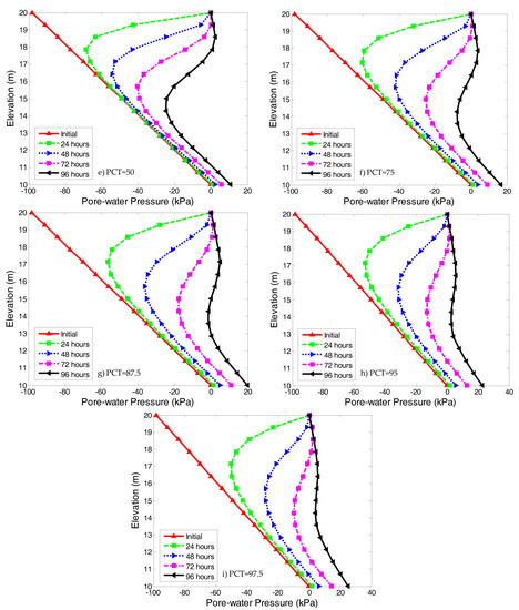 For PCT greater than 50%, the remaining negative pore-water pressure in the soil decreased more rapidly (as shown in Figure 8e–i). The transition between the infiltration zone and the unaffected zone became less distinct. The downward velocity of the wetting front increased, and the groundwater table rose. For PCT = 75% (as shown in Figure 8f), the negative pore-water pressure dropped greatly, and almost disappeared after 96 h of rainfall. Given the same initial suction, the influence depth of rainfall on the slope increased gradually with the increase of PCT. A comparison of the profiles of the pore-water pressure showed that, under the same initial pore-water pressure, the wetting fronts had less depth for cases with low PCT than those with high PCT. The shapes of the profiles were similar, but the rates of downward movement of the wetting fronts were distinct, which indicated that the behavior of rainfall should be related to the SWCC. Decreasing the PCT, the shape of pore-water pressure profiles changed little. It was noted that the most striking difference between different PCT was in the shallow zone. For soils with the same saturated permeability coefficient that were subjected to the same rainfall intensity and duration, the soil with a higher PCT had a greater water storage capacity. Thus, the movement of wetting fronts was much faster in soil with higher PCT. The higher the PCT, the faster the disappearance of the negative pore-water pressure in the soil. In general, the uncertainty of the SWCC can lead to significant errors in predicted pore-water pressure profiles.