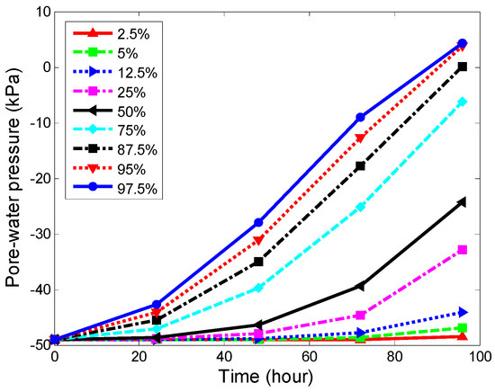 Figure 10 depicts the pore-water pressure at point M (25, 15) in the slope as shown in Figure 3 versus the rainfall duration time for the different PCT of the SWCC. The suction showed a gradual reduction during rainfall and indicated that the negative pore-water pressure at point M with the same rainfall duration decreased with an increase in the PCT value. The change of suction was much smaller when PCT equaled 2.5%, than when PCT equaled 97.5%. A significant change in the pore-water pressure gradient can be clearly seen in Figure 10. The gradient of the pore-water pressure was dependent on the PCT of the SWCC, and increased with increasing PCT. With respect to the SWCC, a higher value of PCT meant a higher degree of saturation or volumetric water content (as shown in Figure 7). In soil with a higher volumetric water content, the movement of water was faster [56], and the negative pore-water pressure decreased more. An increase in infiltration rate inside a soil with increasing PCT could explain this trend. Therefore, the confidence interval of the SWCC had a great influence on the seepage analysis of the slope under rainfall.