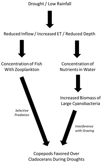 In the present study, we examined the degree to which variation in rainfall and depth might influence the biomass and taxonomic composition of crustacean zooplankton in shallow eutrophic lakes in subtropical Florida. Prior to analyzing the data, we developed a conceptual model that provides a basis for predictions about the zooplankton responses (Figure 1). We predicted that droughts have an influence on the relative biomass of crustacean zooplankton, favoring copepods over cladocerans. This influence may happen for two reasons both related to a concentration of chemicals or animals in lake water with reduced volume. First, the high densities of omnivorous fish that are present in these and other subtropical lakes are concentrated. The fish prey on zooplankton, and cladocerans are most susceptible [1,2]. Second, the concentration of nutrients stimulates the growth of large inedible cyanobacteria, and this selectively interferes with grazing by filter-feeding cladocerans.