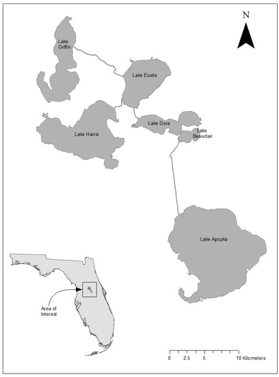 Data were obtained from six lakes (Figure 2) located in the Upper Ocklawaha River Basin, north of Orlando, Florida, between 28°55′ N 81°50′ W and 28°34′ N 81°33′ W. The lakes are shallow, with mean depths ranging from 1.4–3.4 m, and ranging in size from 5–127 km2 (Table 1). The lakes are eutrophic, with total phosphorus (TP) from 38–131 µg L−1, total nitrogen (TN) from 1.8–4.7 mg L−1 and chlorophyll a (Chl-a) from 35–115 µg L−1. All of the lakes are strongly dominated by filamentous and colonial cyanobacteria that attain exceptionally high biomass, i.e., blooms [13], and some lakes have displayed downward trends in nutrients and Chl-a, attributed to nutrient-control programs in the watershed [13,14]. The lakes all have high densities of omnivorous fish [15,16], which is typical for lowland subtropical lakes [2,17,18].