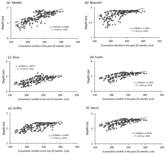 Relationships between rainfall (cumulative amount in prior 25 months) and depth in the six study lakes (a–f). Each filled circle is an individual sampling date and the lines are least squares linear regressions with equations, regression coefficients and significance levels provided.