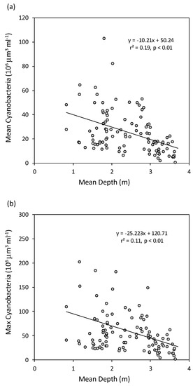 The annual mean and maximal biovolumes of cyanobacteria (one datum from each lake in each year of sampling) were plotted against yearly mean depths. Least squares regression was used to quantify the relationships. Linear models fit the data as well as non-linear models, depending on which gave statistically significant results.