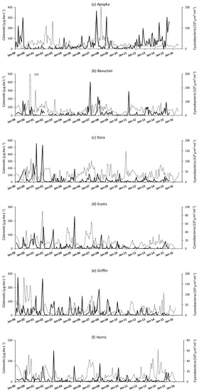 There were only significant (p < 0.05) long-term trends of cyclopoid biomass (Figure 7) in Lakes Eustis (decrease) and Harris (decrease). Cyclopoids presented a seasonal pattern more akin to calanoids than to cladocerans, with biomass peaks at various times in the year, and sometimes there were peaks two or more times in a year. Cyclopoid biomass peaks ranged from below 20 to ca. 200 μg L−1 dry weight per sample, i.e., they never attained the high biomass seen with cladocerans and calanoids. There was not a significant relationship between the magnitude of cyclopoid biomass peaks and water depth. Sometimes, a high peak corresponded with low depth (e.g., 2007 in Lake Apopka), while at other times a high peak corresponded with high depth (e.g., 2003 in Lake Harris). Likewise, there was not a clear relationship between cyclopoid biomass peaks and the biovolume of cyanobacteria. In some cases, when a high biovolume of cyanobacteria occurred, cyclopoid biomass was low (e.g., late 2010 in Lake Dora), while in other cases, a substantive peak in cyclopoid biomass coincided with very high biomass of cyanobacteria (e.g., 2000 in Lake Griffin).