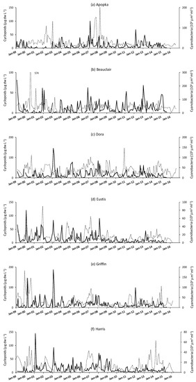 In these interconnected lakes, water flows northward from Lake Apopka to Beauclair and Dora, northeastward from Harris, converges in Eustis, and then flows to Griffin. Finally, the water discharges from Lake Griffin into the Ocklawaha River. During droughts, some of these flows may reverse. The lakes have residential development on their shorelines and water is periodically discharged from them to prevent flooding of lakeside property. Havens et al. [12] showed that this management results in cutting off the top of hydrographs, with a plateau related to the maximal water level beyond which shoreline flooding would occur in each of the lakes. The watershed surrounding the lakes has many land uses. In some areas it is highly urbanized, in other areas it is used for agriculture, and there are homes on much of the waterfront. There also are areas with natural wetlands adjacent to the lakes. A detailed analysis is beyond the scope of this paper; however, land use can readily be seen in Google Earth. Furthermore, there are a large number of reports that deal with land use, nutrient loads, nutrient reduction programs and changes in nutrient concentrations within the lakes. Summary reports can be obtained by contacting the St. Johns River Water Management District.