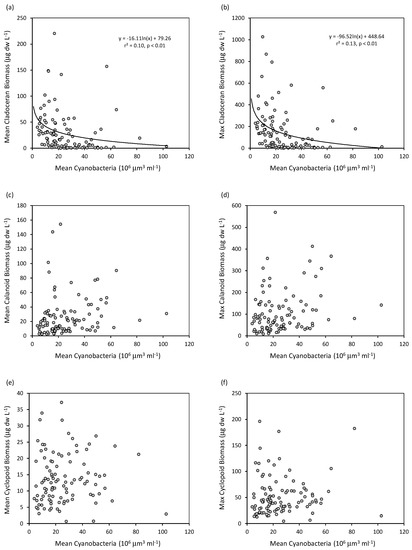 There were significant inverse non-linear relationships between the yearly mean and maximal biomass of cladocerans and the yearly mean biomass of cyanobacteria (Figure 8a,b), albeit explaining a small amount of the total variability. However, there were not significant relationships for calanoids and cyclopoids (Figure 8c–f). The ratio of cladoceran to copepod biomass was higher when cyanobacteria peak biomass was low, and it dropped to near zero when peak cyanobacteria biomass was high. Non-linear regression models explained 18% of the variation in the relationship between the zooplankton ratio and mean annual biomass of cyanobacteria, and 20% of the variation in the relationship with the maximal annual biomass of cyanobacteria (Figure 9a,b). There were not significant relationships between mean or maximal biomass of any crustacean group and mean depth, nor was there a significant correlation between the cladoceran to copepod ratio and mean depth. There was a tendency in the data for cladocerans to be less abundant at shallower depth and the opposite to be the case for copepods, but the data were highly scattered and regression models could not explain even 1% of the variability.