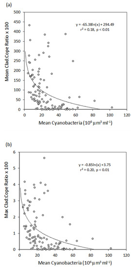 Relationship between the ratio of yearly mean cladoceran to copepod biomass (a) and yearly maximum cladoceran to copepod biomass (b) and the yearly mean biovolume of cyanobacteria. Each filled circle represents one year and lake. Logarithmic regressions are fitted to both datasets.