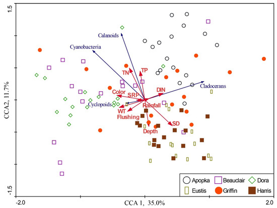 Finally, a redundancy analysis (RDA) was performed using the annual mean data to identify the power of independent environmental variables (TP, TN, SRP, DIN, temperature, Chl-a, dissolved organic color, flushing rate, mean depth, SD, rainfall and cyanobacteria biovolume) on explaining the variation in the dependent zooplankton variables (cladocerans, calanoids and cyclopoids). The analysis was run using Canoco 4.5 [24] with yearly-averaged data from each lake.