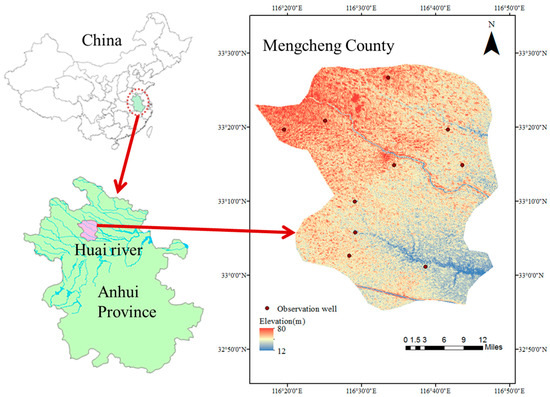 Mengcheng County is in the Huai river basin of Anhui province, China (Figure 1). Mengcheng County is home to 1.40 million people, of which 22.5% are urban and 77.5% are rural. The total area of Mengcheng County is 2091 km2, comprising 318 km2 (15%) urban land and 1773 km2 (85%) of agriculture land, so water is of vital importance for this agrarian county.