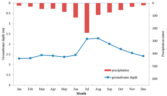 First, the groundwater depth shows seasonal periodicity. Precipitation in Mengcheng County concentrates in June, July and August (Figure 3). Correspondingly, groundwater depth decreases during the three months as the water table rises. In contrast, groundwater depth increases with the decrease of precipitation after September. May and June are exceptions where precipitation increases but groundwater depth does not significantly decrease, probably due to intensive groundwater pumping for irrigation in May and June.