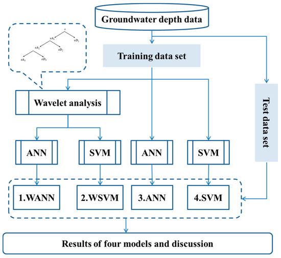 In this study, a hybrid machine learning method combining wavelet analysis is proposed to predict monthly groundwater depth. The core idea is to form a set of subseries of groudwater depth time series by wavelet analysis and then calibrate prediction model for each subseries. The overall method consists of six major schemes (Figure 5), summarised below: