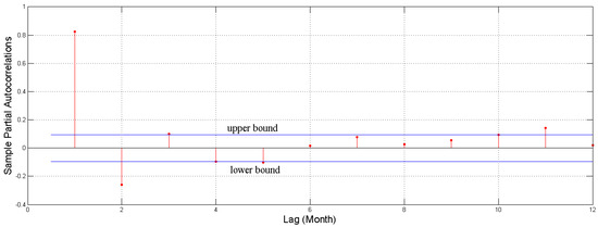 In this study, the prediction model has a “input-output” time-lag structure, where output is groudwater depth for t time step and inputs are goundwater depth in t-n previous months. Here, in order to determin the lag time n, a partial autocorrelation function (PACF) was carried out to test the correlation of the examined time series [37]. Figure 6 plots the PACF of groundwater process with 95% confidence bounds (blue solid line). The correlation pattern indicated that a strong correlation exists among groundwater depths in consecutive months, which proves the feasibility of forecasting groundwater depth using groundwater depth in previous months. Further, an autoregressive model with lag time 5 may be warranted for this time series, since there are notable partial autocorrelation for the lag 1 to 5.