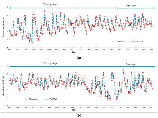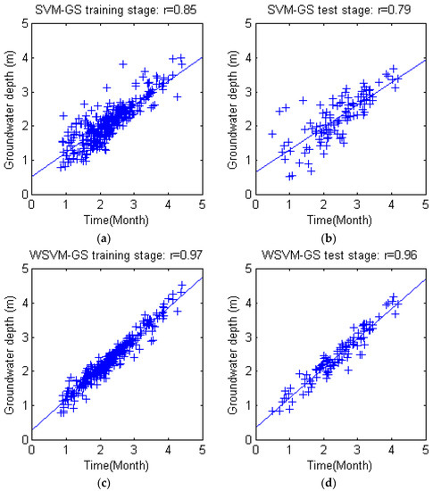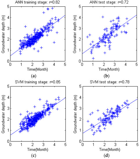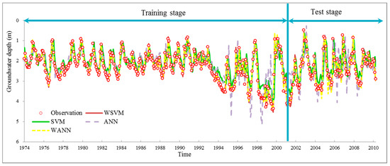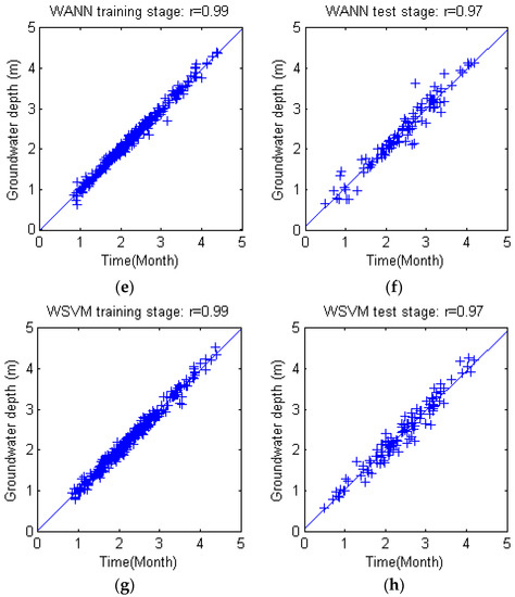 The fitting and test results of four models and actual groundwater depth series are shown in Figure 11. Scattered distribution of predicted values and observed values with linear regression trends are plotted in Figure 12. The figures show clearly that the overall performance of WANN and WSVM are superior to ANN and SVM models. The trends of WANN and WSVM have better agreement with observations than ANN and SVM models in Figure 11; scatter plots show that the estimation of WANN and WSVM are closely around 1:1 curve with few outliers in Figure 12. Moreover, Figure 11 indicates that ANN model performs less well than the SVM model, particularly in the sudden rises and declines during 1995 to 2008. Further indication is needed to distinguish differences between WANN and WSVM, for they have the same r coefficient in both training and test stages according to Figure 12e–h.