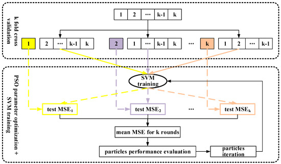 SVM training principle combined with PSO parameter optimization and k-fold cross validation.