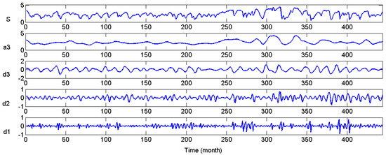 The three level DWT result is shown in Figure 10. The three level DWT decomposed groundwater depth (S) into low frequency subset (a3) and three high frequency subsets (d1), (d2) and (d3). Obviously, S = a3 + d1 + d2 + d3. The subseries show apparent differences from each other, but the feature of each subseries are much more orderly and consistent, which will facilitate the rules derivation for each subseries.