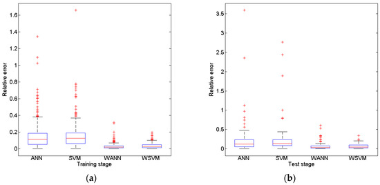 Relative error box plot of four models (a) training stage (b) test stage.