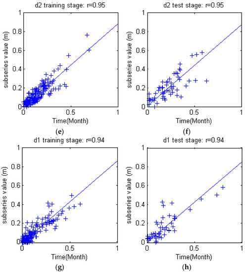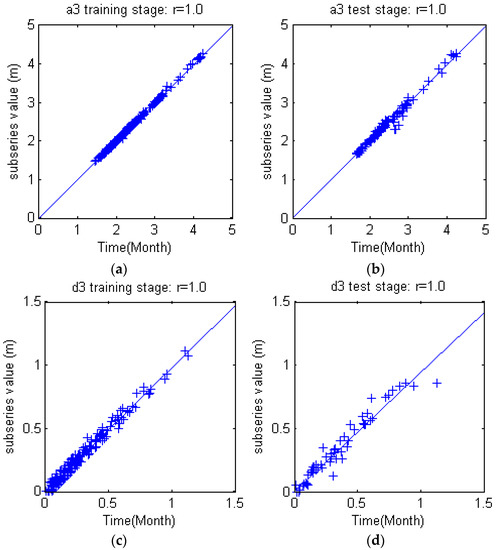 Figure 14 shows scattered plots for simulated data and original subseries data of each subseries. With the increase of subseries frequency, the fitting and test performances tend to decrease slightly. For low frequency subseries a3, simulated results fit raw subseries data precisely; when it comes to d2 and d3 subseries, the fitting curve gradually deviated from 1:1 line, and the samples are getting diverse. Subseries d4 indicates an increasing simulating error. The differences can be explained by the wavelet analysis theory: stable characteristics of original time series were preserved in low frequency subseries a3; high frequency subseries comprise complicate information and noises, which are therefore difficult for characteristics extraction. The importance of data preprocessing is also shown here: even for the carefully calibrated WSVM model, data “quality” still profoundly affects model performance.