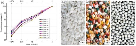 The characteristics of soil mtrix and rock blocks used for bimsoils in this study. (a) Grain size distribution using sieving method for the used soil matrix; (b–d) Gravel, pebble and round rock blocks used in bimsoil specimen preparation, size range from 2 to 5 mm according to BS1377-1 (1990).