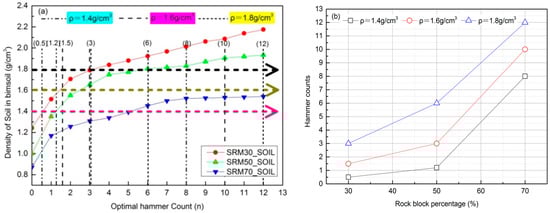 The relationships between the hammer count and soil density and the rock block percentage (a. Plot of the soil matrix density against hammer count for specimens with RBP of 30%, 50%, and 70%, respectively; b. Determination of the optimal hammer count for bimsoil specimens with different soil matrix density).