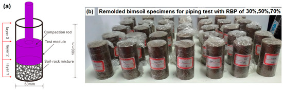 In this work, dynamic compaction was used for the preparation of the bimsoils pecimens [10,11,12,26,27]. The appropriate optimal hammer count was determined according to the relationship between the hammer count and the soil matrix density Compaction was done in a split mould by applying a dynamic pressure, using a compaction test apparatus. Owing to the high difference of elastic modulus between soil matrix and rock block, compactness of bimsoil is actual the compactness of soil matrix. Soil density is a very important factor affecting the permeability of bimsoil [28]. As a result, how to control the hammer count is crucial to the sensitive analysis of piping erosion. In this work, determination of hammer count producing specimens with different soil density is from the relationship between the soil density and the optimal hammer count, as shown in Figure 2a. The soil matrix density for bimsoil with RBP of 30%, 50%, and 70% increased with the increase of hammer count. To change the soil density, three dot dash lines were drawn to intersect with the curves in Figure 2a, the corresponding of abscissa values are determined as the optimal hammer count. Figure 2b plots the relationship between different soil densities and hammer counts. When the RBP is 70%, the soil matrix in the specimens is difficult to compacted, considering that the rock blocks in bimsoil specimens with RBP of 70% would be crushed with too much hammer counts, therefore, 12 times was determined as the optimal hammer count. All of the specimens were compacted layer by layer with three layers, as shown in Figure 3a. The length and diameter of the prepared samples were 100 and 50 mm. The prepared cylinder-shaped specimens with RBP of 30%, 50%, and 70% were shown in Figure 3b.All of the tested specimens were sealed with plastic wrap to prevent water evaporation and kept the water content constant.