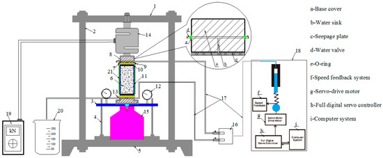 Schematic diagram of the piping testing system, which is composed of the rigid specimen holder, the servo pressurized water-supply system, and the specimen chamber system [12]. (1. Upper cross beam; 2. Rigid column; 3. Platform; 4. Guide bar; 5. Lower cross beam; 6. Bimsoil specimen; 7. Self-adhesive tape; 8. Permeable cap; 9. Hose champ; 10. Filter paper; 11. Heat shrink tubing; 12. Seconds counter; 13. Water valve; 14. Force sensor; 15. Hydraulic jack; 16. Three-way valve; 17. Water tube; 18. Servo-injection water system; 19. Force sensorand; 20. Measuring cup).