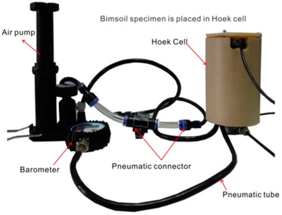 This experimental setup was previously detailed described by Wang et al. [12]. Figure 4 shows the layout of the piping test system includes the rigid specimen holder, the servo pressurized water-supply system, and the specimen chamber system. The rigid specimen holder is composed of the beams, rigid column, rigid platform, guide bar, etc. The purpose of the specimen holder is to keep the specimen chamber system steady on the platform during the whole piping test. The servo pressurized water-supply system includes the main parts of the speed feedback component, servo and drive motor, full digital servo controller, and the computer. The sample chamber system is composed of two metal seepage plates, two metal caps (upper one and lower ones), two hose clamps, and a length of heat shrink tubing accommodating the bimsoil specimen. The metal permeability caps are specially designed for the piping test; they contain the inlet valves, outlet valves, and some grooves. The diameter of the inlet and outlet valveis 3 mm. The heat shrinks the tube and the metal cap is connected with the self-adhesive type and hose clamps. The purpose of the self-adhesive type is to prevent leakage, and its sealing hydraulic pressure can reach 1 MPa. The detailed dimensions and structure of the mental cap, and locations of the inlet and outlet valve are shown in Figure 5. The confining pressure system (Figure 6) is composed of the Hoek cell, air pump, barometer, pneumatic connector, and pneumatic pipe [12].