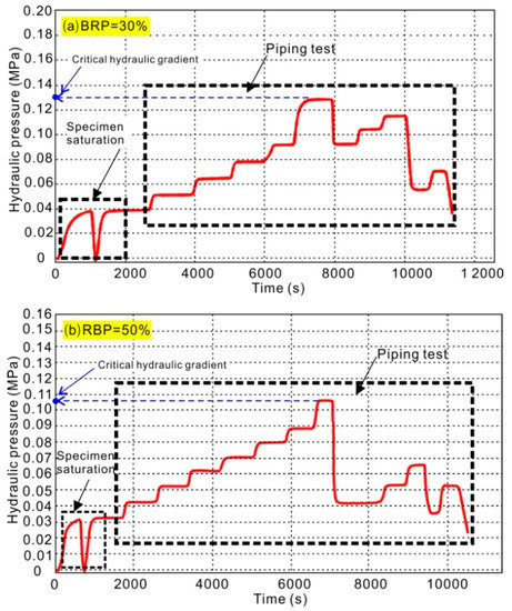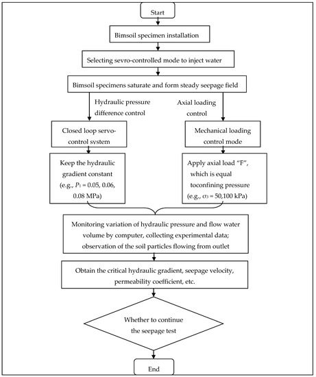 To study the flow-erosion-stress coupled evolution process of bimsoil specimens with different RBPs, and obtain some important results from the piping test, the detailed technical flowchart is shown in Figure 7. The main procedures are as follows: (1) Specimen preparation and saturation. The bimsoil specimen is produced according to the method above. Saturation was performed with vacuum treatment, and then installed by the lower cap, upper cap, hose heating clamps, plastic self-adhesive tape, and shrink tube. The specimen is installed to be kept in the vertical state in order to avoid eccentric compaction. Water is injected at a low constant flow rate to saturate the specimen; (2) Formation of steady seepage field. During flow conditions, the specimen chamber system is placed on the rigid specimen holder. During the water-injection process, water is supplied by a constant pressure increment or a constant flow velocity. It is until the curve of the hydraulic pressure against time gradually became level, and the slope of the water flow curve against time is a constant value, that the steady seepage has formed in the specimen. The detail saturation process has been described by Wang et al. [12]; (3) Isotropic consolidation. The axial stress and confining pressure are exerted simultaneously, making the specimen in the state of equivalent stress; and, (4) Applying seepage pressure step by step. When water flow reaches steady state, we record the water-outflow volume, hydraulic pressure and flow time at each injection steps, and calculate the hydraulic gradient. The permeability coefficient basedon the Darcy law is obtained as below: