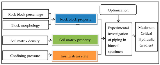 Figure 7 shows the flow chart for the multiple parameters evaluation during piping test the in bimsoils. Four factors were considered in this work. Rock block percentage is an accepted factor that influences the mechanical and hydraulic properties of bimsoil, whether by numerical test or laboratory experiments, this factor is always considered [2,3,4,5,6]. The density of soil matrix influences the flow capacity of bimsoil. Zhou et al. [28] have conducted orthogonal test to study the effect of various factors on bimsoil permeability, and showed that soil matrix density was the first influenced factor on the bimsoil permeability coefficient; in addition, the block morphology has effect on its permability. The stress state of the bimsoil also has an obvious effect on the evolution of piping [29,30,31,32]. Studies have shown that for an undisturbed sample, the critical hydraulic gradient is smaller than undisturbed specimen [10,11,15]; therefore, the piping test should consider the factor of stress state. Figure 8 shows the research idea of the multiparameters evaluation and optimization for piping evolution.