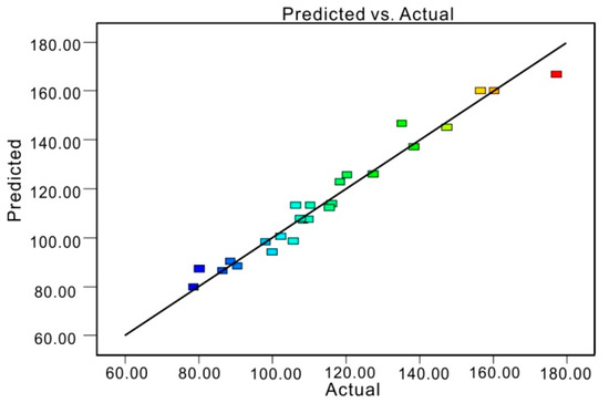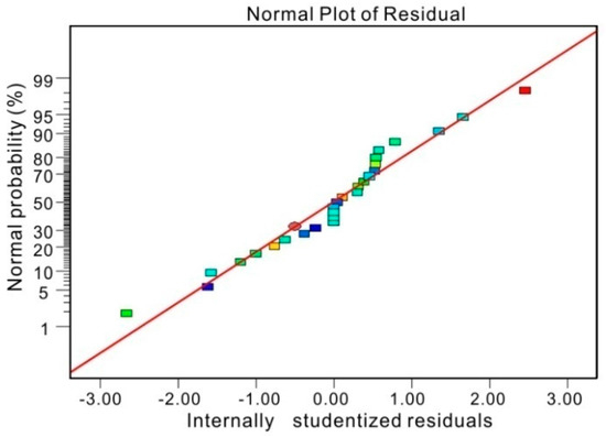 Figure 10 shows the normal plots of residuals, which can reflect the distribution of the residuals for the response value of the critical hydraulic gradient. All of the test points in the “Normal Plot of Residuals” fall on the straight line, implying that the residuals are normally distributed, and the model is significant. Figure 11 shows the “Predicted versus Actual” for critical hydraulic gradient, illustrating whether the generated equation of gradient response surface accurately predicts the actual values. It can be seen that generated hydraulic gradient response surface models provide such reliable predicted values for hydraulic gradient, as compared to the actual values of the hydraulic gradient.