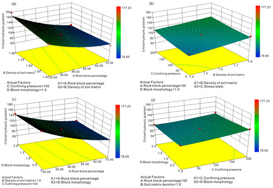 The anova for the response surface quadratic model of CHG is shown in Table 6. From the result, the model F-value of 24.01 implies the model is very significant, the change is less than 0.1% that a “Model F-Value” this large could occur due to noise. Values of “Prob > F” less than 0.05 indicates that the model variations are significant. In this case, the model p-value prob of the studied factors is <0.0001, 0.0020, 0.013, and 0.0325; this result indicates that the factors of A, B, C, and D are all significant model terms. The smaller the p-value pro, the more sensitive of the factor is to the response surface. The influential order of these four factors is: A-rock block percentage > C-confining pressure > B-soil matrix density > D-block morphology. The equations fitted to the critical hydraulic gradient response surface in terms of actual factors are: