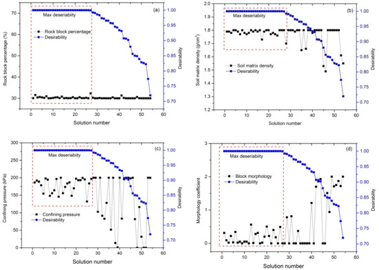 The index of CHG indicates the resistance capacity of bimsoil to seepage force, the larger the CHG value, the better capacity of bimsoil is. In this section, the RSM numerical optimization algorithm is employed to select the set of variables that leads to the maximum CHG value. A total of 54 optimal solutions are generated after the RSM numerically optimization. The desirability value ranges from 0.376 to 1.0. We select the solutions with the maximum desirability value to analyze. Figure 13 shows the relationship between the studied factors and the desirability value. The red box indicates the desirability value equal to 1.0, which are the optimist solutions. From the optimization results, the rock block percentage is about 30% if we want to obtain the maximum CHG, it corresponds to the smallest the block content. Higher soil matrix density is desirable to improve the CHG. When to get a high CHG, confining pressure ranges from 160 to 180 kPa, in-situ stress state has an important influence on the CHG. The factor of block morphology is not so sensitive to CHG, and angular rock block tends to improve CHG as compared to round block. Among the 54 solutions, we select the 20 cases when the desirability is 1, as listed in Table 7.