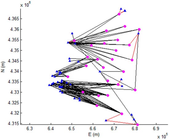 Graphic representation of the links between source nodes and destination nodes. Blue triangles represent source nodes; magenta circles represent destination nodes; black lines represent connections between source nodes and destination nodes; and red lines represent connections between source nodes and destination nodes with pump stations.