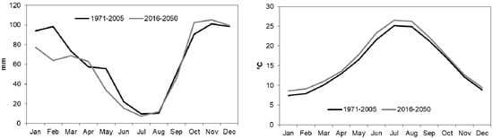 Changes in mean monthly precipitation (%) and temperature (°C) (2016–2050 vs. 1971–2005).