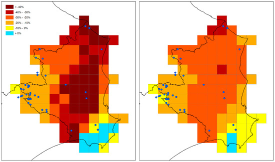 Results of the future scenario analysis (2016–2050 with RCP4.5) show an average reduction in precipitation of 8.9% and an average increase in temperature of 1.0 °C for the whole province of Crotone. Figure 3 shows the projected monthly change for both precipitation (left) and temperature (right). Precipitation reduction is particularly relevant for winter (up to −35% in February) and, secondarily, for late spring, while some small increase is projected for autumn. Temperature increase concerns the whole year, with peaks around +1.5 °C for summer, while a lower increase of around +0.5 °C is forecasted for the last months of the year.