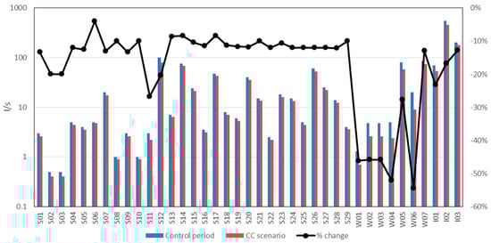 Figure 4 provides an overall picture of the projected changes in baseflow and total runoff in the province of Crotone. The average total runoff reduction for each of the 5-km resolution cells was considered to be about 19%, while the average contribution to the baseflow decreases on a cell-by-cell basis of about 25%. The main reductions are projected to occur in the central areas of the province where not many source nodes are present. Percentage increase concerns areas with low absolute precipitation values (i.e., the southeast of the province), which cannot contribute significantly to enhance overall water availability. Table 3 and Figure 5 show the projected changes in the available flow from each of the 39 source nodes. The reduction in available volumes ranged between 3% and 54%.