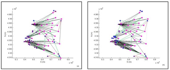 Output of the model for the two scenarios considered. On the left (a), links between source nodes and destination nodes with reference to the current availability; on the right (b), links between source nodes and destination nodes with reference to the future climate change scenario. Green lines indicate new connections; blue triangles represent source nodes whose water is completely distributed to users; blue triangles with red borders indicate source nodes which are also connected with the dummy destination (source node with a surplus of water that remains at the source node itself); magenta circles represent the destination nodes; black solid lines represent pre-existing connections; dotted gray lines represent deleted links; red lines represent existing links with pump stations.