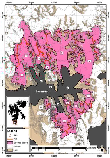 Study area: (PPS) Polish Polar Station Hornsund; (ELA) Equilibrium-Line Altitude in 2014; selected glaciers: (1) Hansbreen; (2) Paierlbreen; (3) Mühlbacherbreen; (4) Kvalfangarbreen; (5) Storbreen; (6) Hornbreen; (7) Svalisbreen; (8) Mendelejevbreen; (9) Chomjakovbreen; (10) Samarinbreen; (11) Körberbreen; selected bays: (A) Burgerbukta; (B) Adriabukta; (C) Brepollen; (D) Samarinvågen. The 50 m contour lines are based on the Digital Terrain Model (2014) published by the Norwegian Polar Institute. The glacier basin boundaries follow [] with reshaped glacier termini from the end of melting period in 2014.