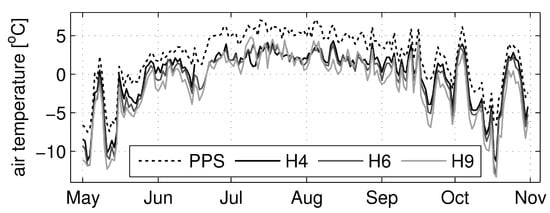 Air temperature changes in the 2014 melting season at the following sites: (PPS) Polish Polar Station Hornsund; (H4, H6, H9) Hansbreen.