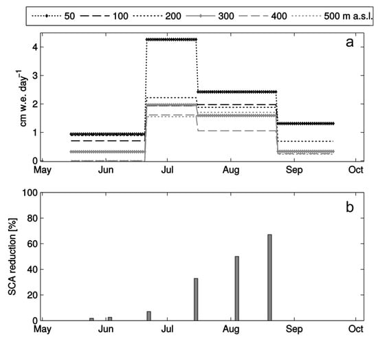 Variability of the surface melt rate based on mass-balance stake data (a) and Snow-Covered Area reduction based on Landsat 8 images (b) on Hansbreen in the melting period of 2014.