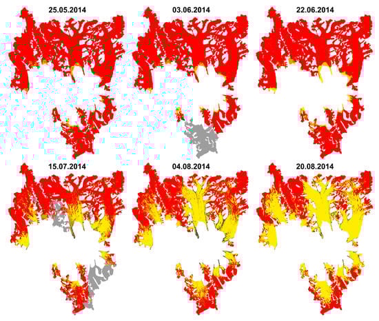 Variability of the Snow-Covered Area on Hornsund glaciers at individual stages in the melting period of 2014, based on Landsat 8 images: red—snow cover; yellow—glacier ice; black—debris; grey—cloud mask.