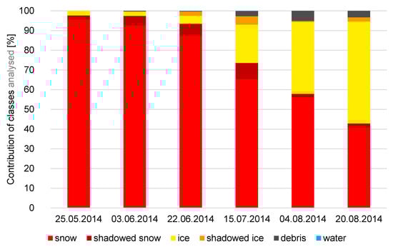 Maximum Likelihood supervised classification statistics. Percentage contribution of the classes analysed at the individual stages in the melting period of 2014.