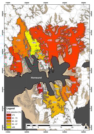 A noticeable reduction in the Snow-Covered Area (SCA) was seen at end of June, when the SCA was changing at a rate of −0.86% day−1. Consequently, the ice-covered area was gradually expanding, and by the end of August, the percentage of the ice class was 11% higher than that of the snow class (Figure 5). The total SCA reduction during the studied period equalled −0.56% day−1. When comparing the individual glaciers, the reduction of SCA varied considerably, ranging from −18% (Mühlbacherbreen) to −74% (Körberbreen) with an average of −52%. Mühlbacherbreen was the only glacier with insignificant SCA reduction. Previous papers focusing on snow distribution on Svalbard glaciers highlighted that interior areas are characterized by the local continental microclimate, where lower air temperature persists throughout the year [,,]. This dependency is visible both on the northern and southern coasts of the Hornsund Fjord (Figure 6). The melting of the snow cover on Hornsund glaciers continued for several more weeks. However, the lack of later satellite data made further analysis impossible. The latest satellite image that was available, dated 21 September, had already been taken after the first snowfall episode.