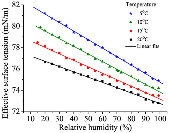 The effective surface tension of a water droplet has been demonstrated to decrease as the air humidity increases [38,39], as shown in Figure 1.