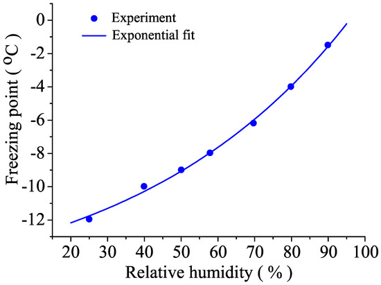 As the surface tension or the surface energy are critical factors in the thermodynamics of droplet’s growth, it is clear that air humidity plays a fundamental role in fog stability. In fact, recent experiments demonstrated that the freezing of droplets is strongly dependent on the humidity [29], as is shown in Figure 2. This means that, within an uncertainty of ±0.4 °C, freezing of supercooled water is triggered whenever the line is crossed by cooling or by increasing humidity. This explains the existence of stable liquid water droplets in mists well below 0 °C.