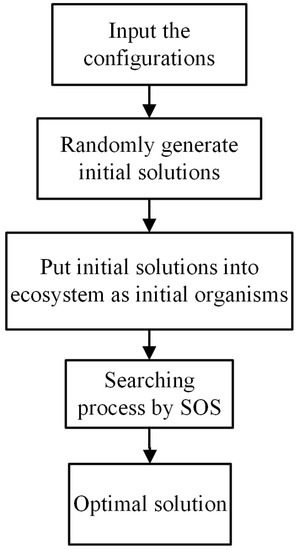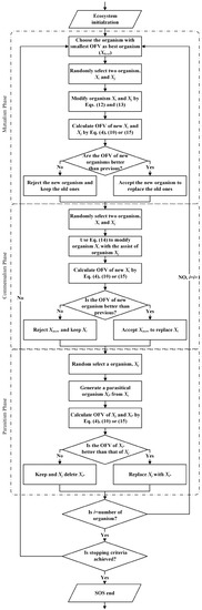 Figure 3 shows the flowchart of an SOS algorithm. SOS starts with an initial population named the ecosystem. A group of organisms is randomly generated in the feasible solution domain and then added into the initial ecosystem. Each organism is considered as a candidate solution (CAS) for the corresponding problem with a certain objective function value (OFV). The search procedure begins when the initial ecosystem is set up. In the searching procedure, each organism will get to benefit or be harmed from continuously interacting with another organism in three different types/forms of symbiosis explained above.